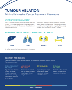 This is a minimally invasive procedure used to treat solid cancers. It is the direct application of thermal energy or chemicals to a tumour for the purpose of eradication or substantial destruction. Radiological imaging is used to guide and position a special needle into the tumour. This is a percutaneous procedure, meaning it requires only a tiny hole, usually less than 3mm in which the needle is inserted.