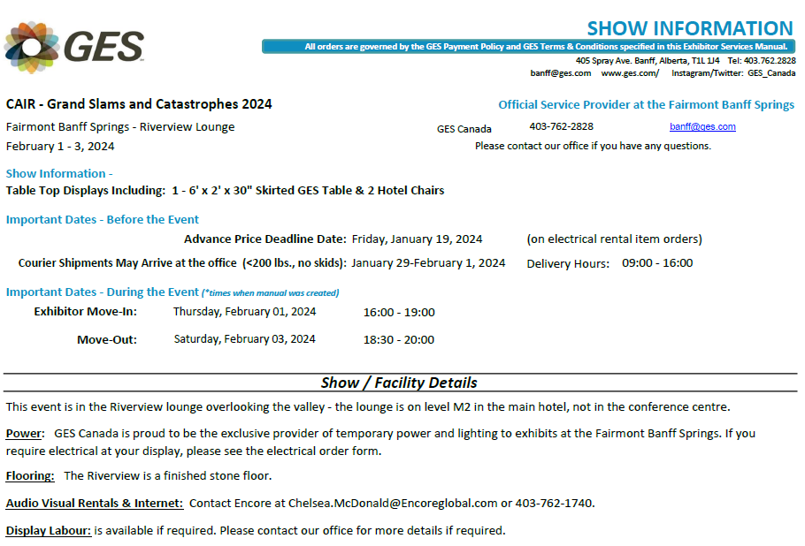 Fairmont Banff Springs does not handle exhibitor goods/shipments. As such, CAIR is working with GES for material handling. Shipments are to be sent directly to GES to store and handle as per the exhibitor information provided. Material handling costs are the responsibility of the exhibitor. Guests bringing goods with them are responsible to load from / to their vehicle to exhibit. For those who will be shipping material to the event, please use the attached shipping label to send your box(es)*.